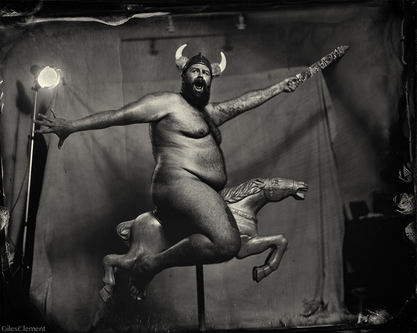 Cette photo de Giles Clement, représentant un viking nu sur un cheval de manège en aluminium, est un ferrotype réalisé avec une chambre Orbit 8 x 10 et un Tessar 185mm f/4.5.